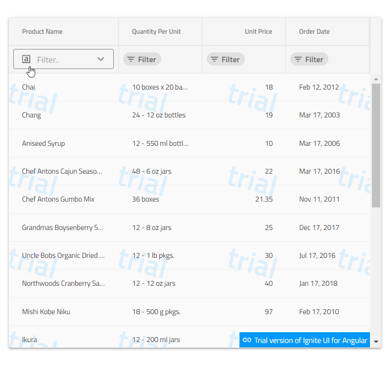 Аll this brings us to, the built in functionality of the igx-grid component – the quick filtering modе, best fits your description at the moment. It will provide the ability to select a condition, enter a value in an input field, select a date in a datatype column and all that is a maximum of 4 clicks as you expect.