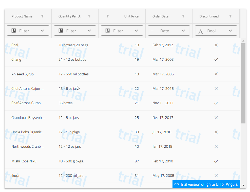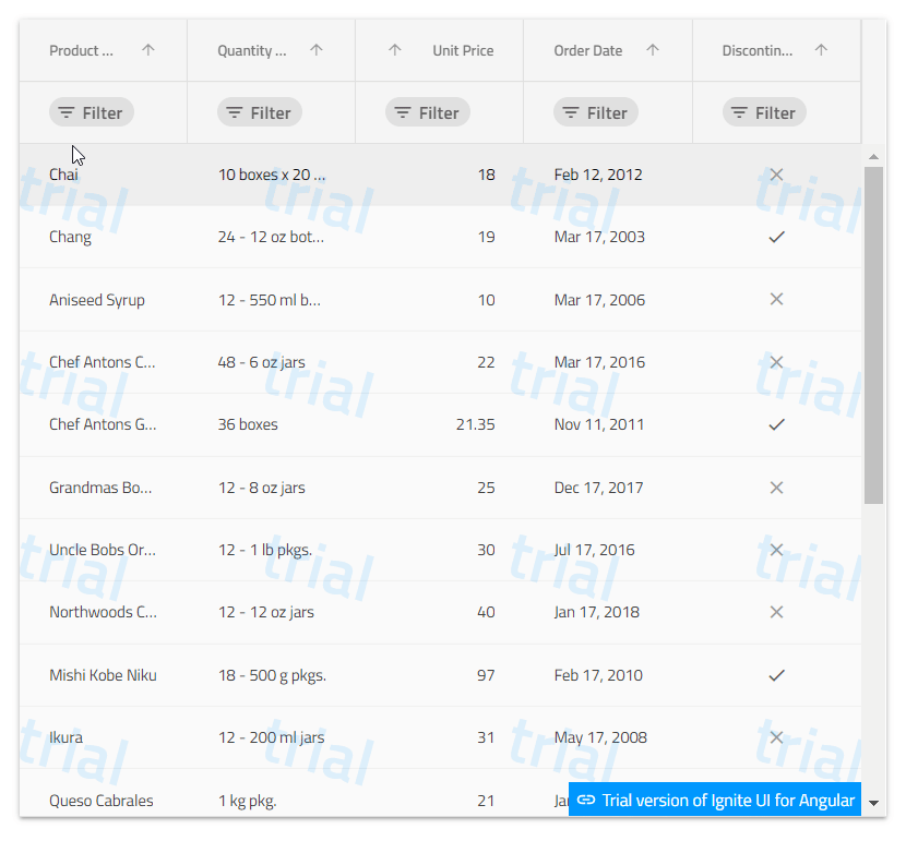 However, Ignite UI Angular has a huge variety of features and what I strongly suggest is to check out the Ignite UI Angular Excel Style Filtering of the igx-grid component. The Excel Style Filtering offers selection of a given condition for each column of the grid according to its data type, as well as offers selection of a value from the given column and filtering of the columns. To enable excel style filtering the allowFiltering should be set to true and the filterMode should be set to excelStyleFilter.